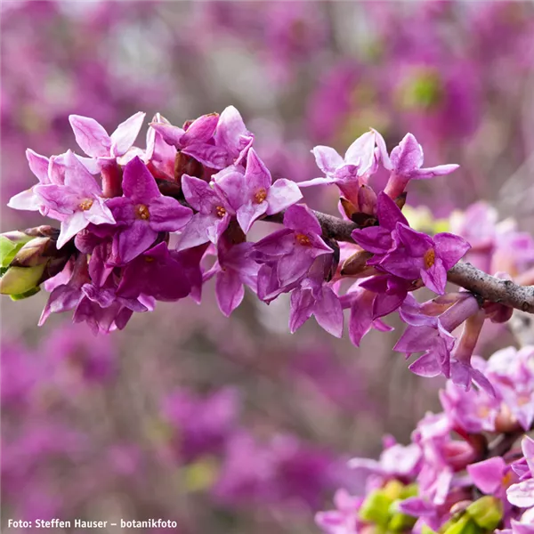 Der Echte Seidelbast (Daphne mezerum) ist ein heimischer Strauch, der meist eine Höhe von einem Meter oder etwas darüber erreicht. Der Strauch blüht im Frühjahr mit duftenden rosa-roten Blüten. Im August bis September entwickeln sich leuchtend rote Beeren, die zwar schön, aber sehr giftig sind.