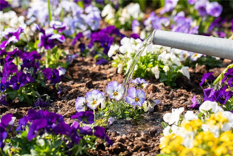 Hornveilchen stellen keine besonderen Ansprüche an ihren Standort und gedeihen sowohl an sonnigen als auch an halbschattigen Plätzen. Der Boden sollte leicht feucht und locker sein. Hornveilchen können sowohl im Beet als auch im Topf angebaut werden. Bei Anzucht im Topf empfiehlt sich gut durchlässige Gartenerde oder humusreiche Balkonblumenerde. Im Beet sollte auf jeden Fall mit Kompost oder Vorratsdünger gearbeitet werden. Die Aussaat im Freien ist das ganze Jahr über bis September möglich, da Hornveilchen winterhart sind. Junge Hornveilchen können im Beet in einem Abstand von etwa 10 Zentimetern gepflanzt werden, solange der Boden frostfrei ist. Bei Bodenfrost, meist zwischen Oktober und Februar, legen Hornveilchen eine Blütenpause ein. Obwohl sie Temperaturen bis zu 15 Grad unter Null standhalten, sollten sie den Winter über dennoch mit Tannenreisig oder Vlies abgedeckt werden, um die Pflanzen vor starkem Frost und Austrocknung zu schützen. Nach dem Winter können Hornveilchen, unterstützt durch eine Startdüngung, für eine reiche Frühjahresblüte sorgen, die bis weit in den Frühsommer hineinreicht.